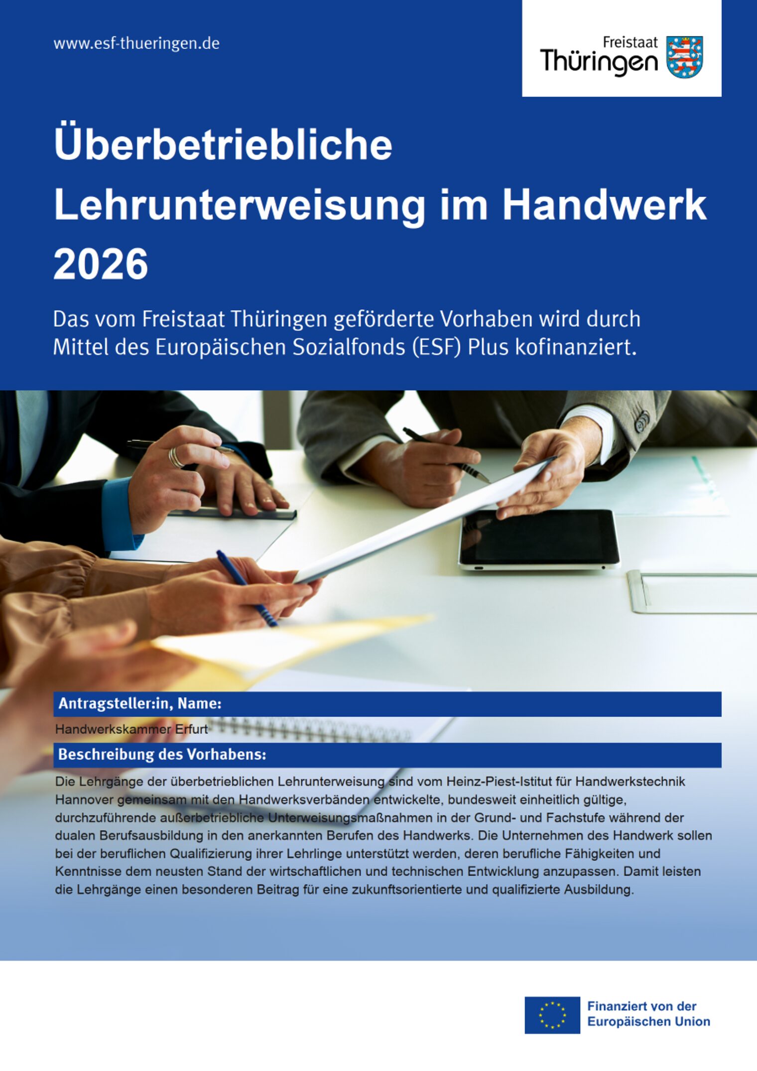 Die Handwerkskammer Erfurt stellt die Anträge auf Gewährung der genannten Zuschüsse bei den jeweiligen Institutionen.