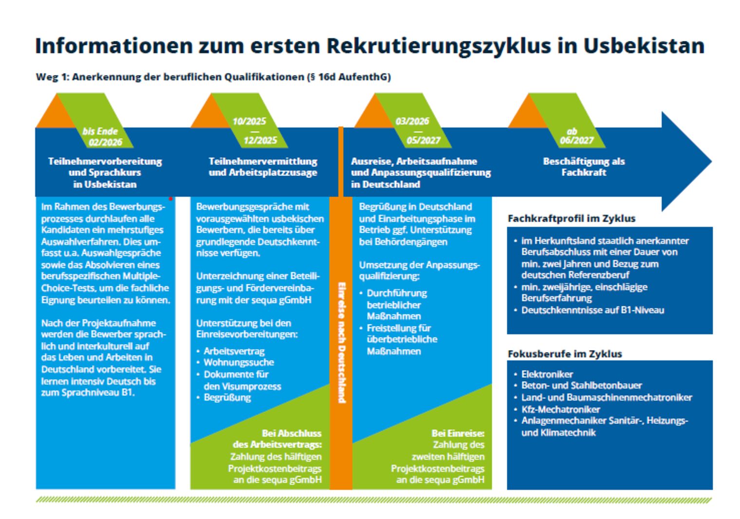 Im Rahmen des Projekts werden in fünf Rekrutierungszyklen gut ausgebildete und berufserfahrene Fachkräfte in Kolumbien und Usbekistan rekrutiert und an deutsche Unternehmen vermittelt. Der Fokus liegt dabei auf Bau, Elektro, SHK, Metall und Kfz-Berufen. Vor Einreise erhalten sie außerdem einen neunmonatigen Deutschkurs.