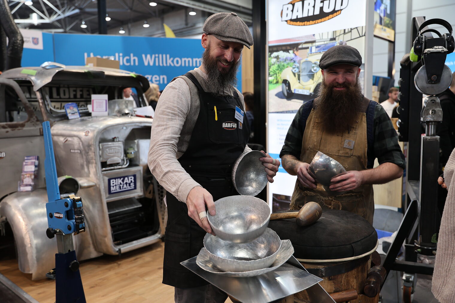 Handwerkskunst am Oldtimer-Stand: Der Oldtimer-Betrieb Barfuß zeigt handwerkliche Blechbearbeitung und Restaurierung – Tradition und Technik treffen auf Leidenschaft für klassische Fahrzeuge.