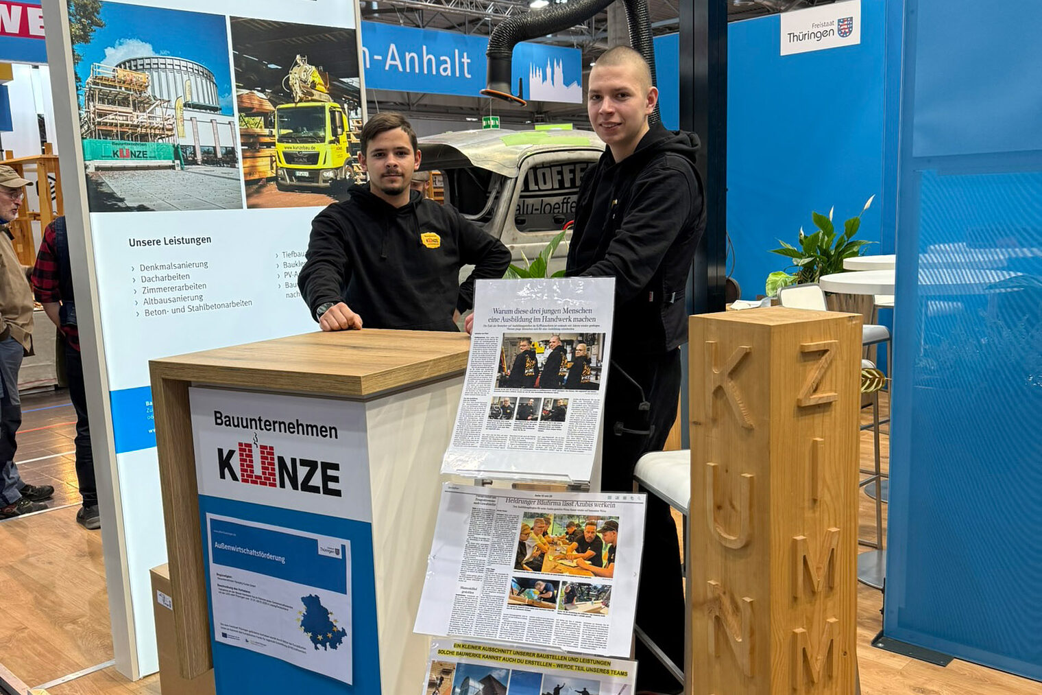 Die Dachdecker-Azubis Tyson Reiße (l.) und Phil Felgentreff am Stand des Bauunternehmens Kunze aus Erfurt.