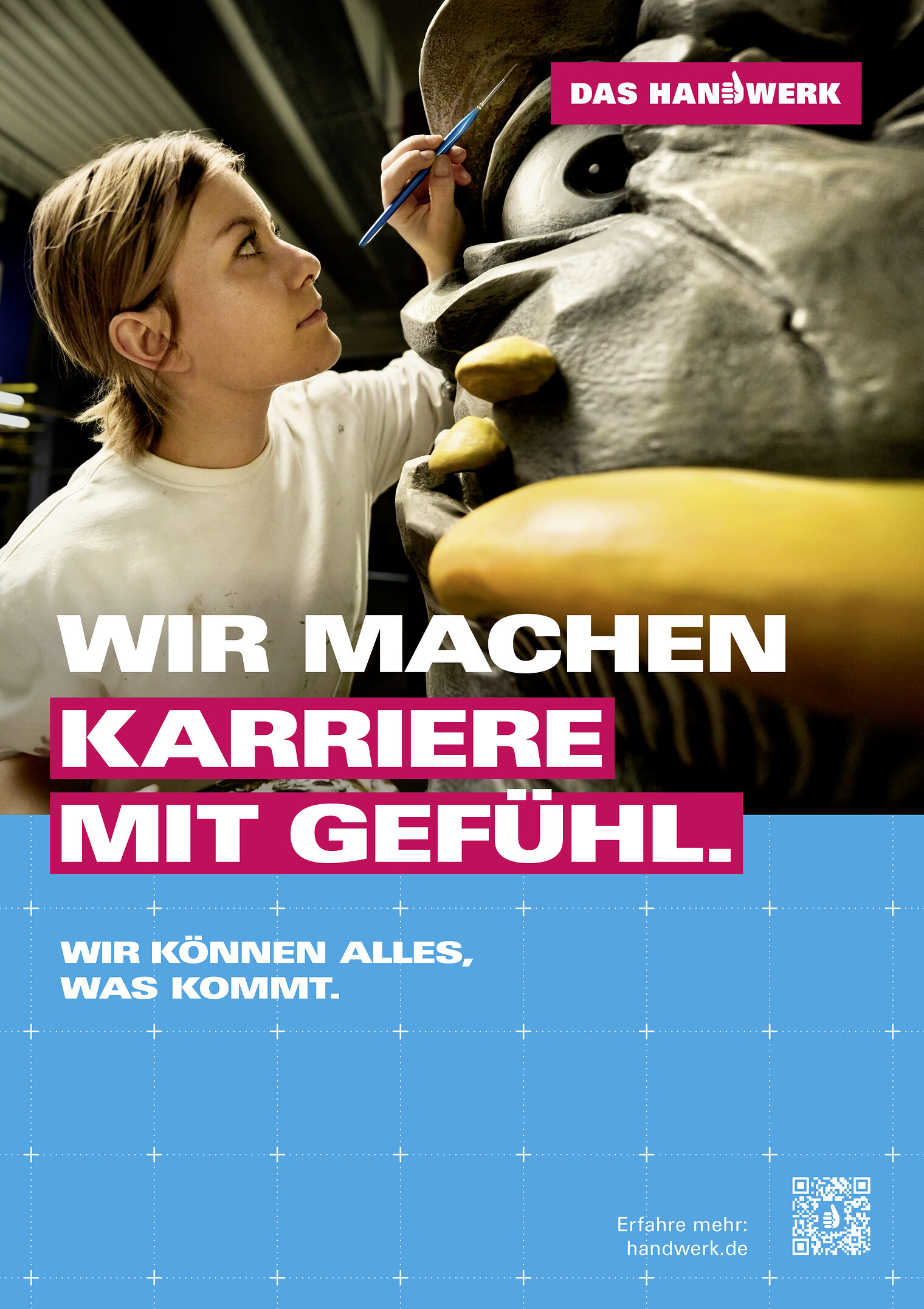 Muss Karriere immer Kälte, Hamsterrad und Ellenbogen bedeuten? Das Handwerk stellt diesem klassischen Bild einen eigenen Karrierebegriff entgegen und besetzt damit ein Thema, mit dem es bislang nicht unbedingt in Verbindung gebracht wird. Die Kampagne, die ab heute deutschlandweit zu sehen ist, steht unter dem Motto „Wir machen Karriere mit Gefühl.“ Sie wendet sich vor allem an die junge Generation, die eine herkömmliche Karriere „um jeden Preis“ zunehmend ablehnt.