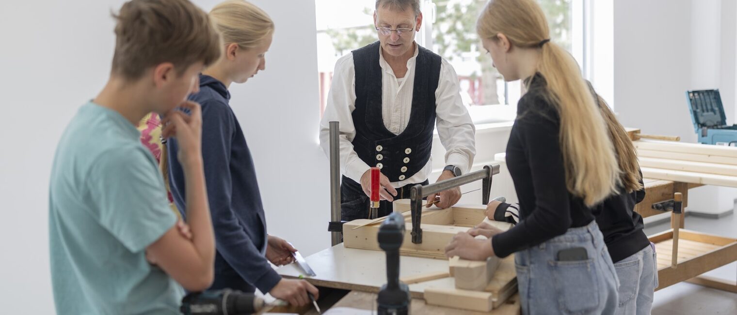 Tag des Handwerks in Leinefelde-Worbis: Zimmermeister Tino Gorf erklärt den Schülerinnen und Schülern, was genau zum Bankbau gehört und wie mit Holz umgegangen wird.