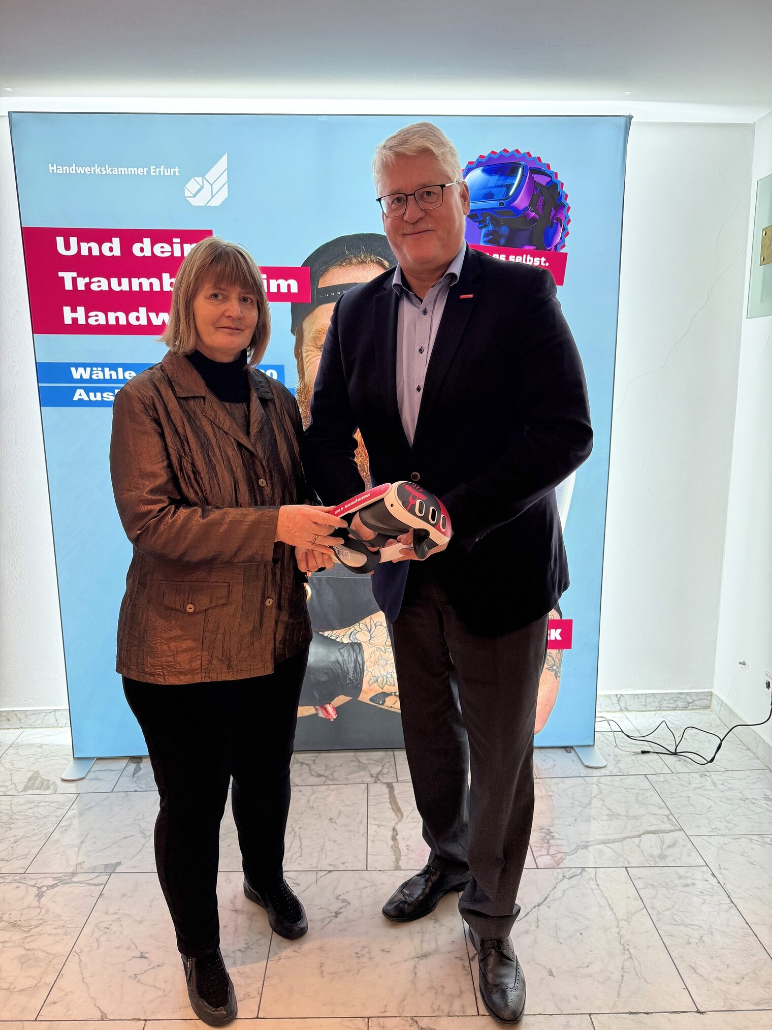 Helgard Anding (Geschäftsführerin a. D. des Fleischerhandwerk Thüringen e.V.) nahm die innovative VR-Brille von Thomas Malcherek, Hauptgeschäftsführer der Handwerkskammer Erfurt entgegen.